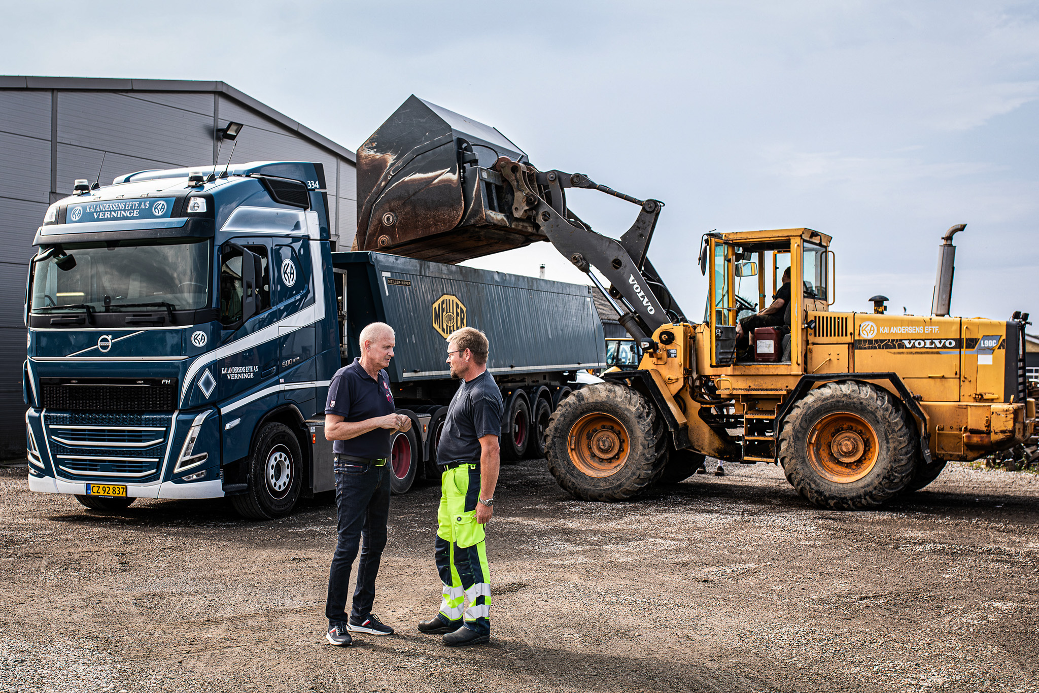 En chauffør var på arbejde i en lejet gummiged, hvilket er hverdag hos Kai Andersen Eftf. A/S fra Tommerup på Fyn. Han skulle hente noget flis, og da gummigedens grab blev stukket ind i bunden af stakken, kollapsede den. Flis væltede fra 10 meters højde ned over gummigeden. Heldigvis slap chaufføren med skrækken, men det gjorde gummigeden ikke.