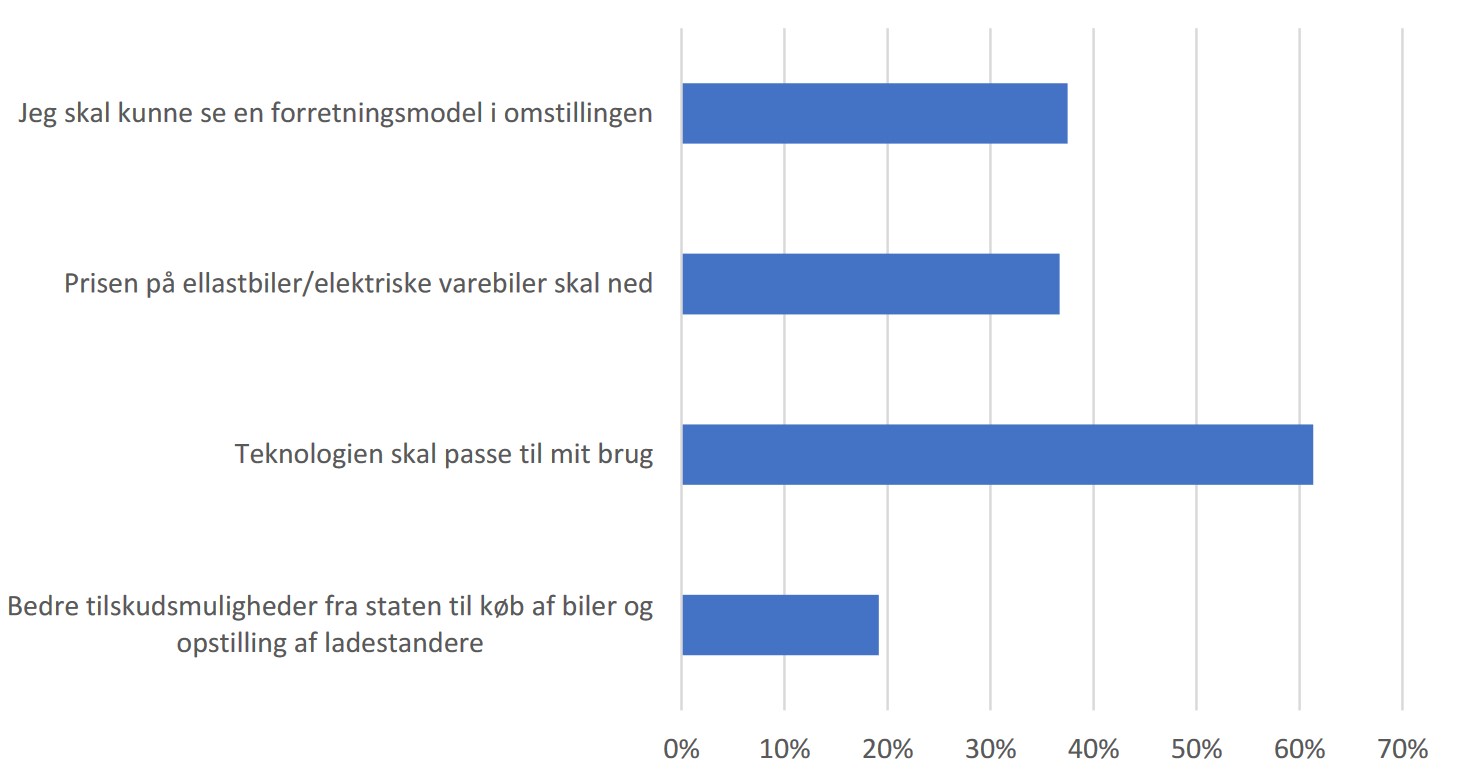 På spørgsmålet om, hvad der skal til, for at der er villighed til at skifte fra diesel til el, svarer to ud af tre, at el-teknologien skal svare til den funktion, de nuværende biler har i virksomheden. Og her kommer tvivlen til udtryk i kommentarsporet i rundspørgen: